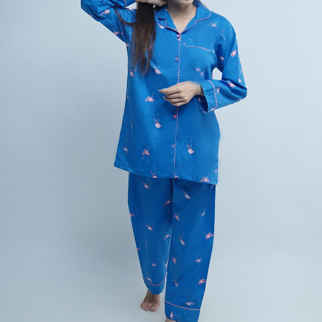 PJ set in soft cotton fabric. Notch collar and button through opening. Full sleeves