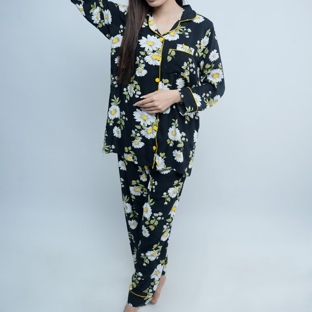 Linen PJ set in soft fabric. Notch collar and button through opening. Full sleeves