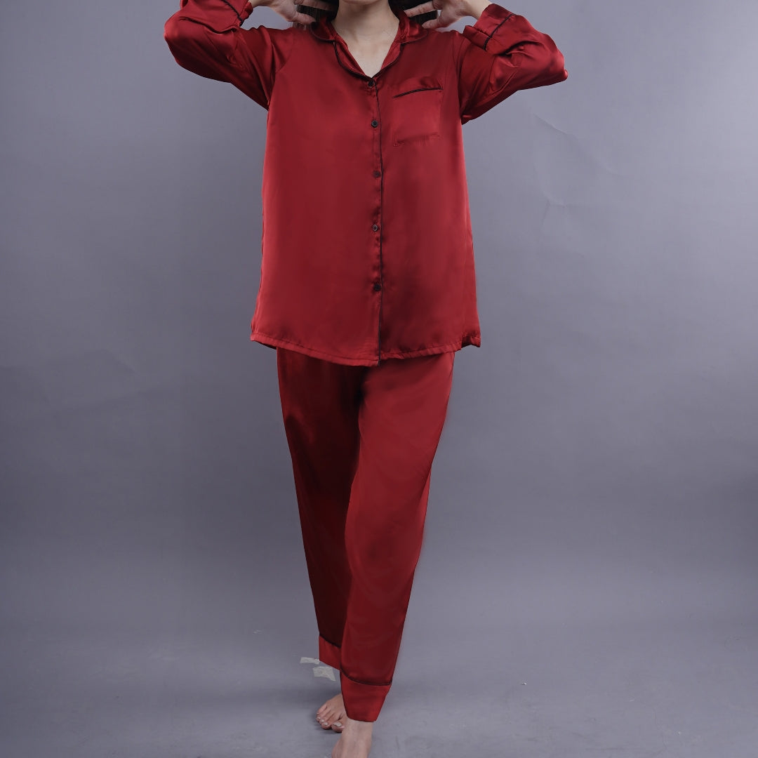 Silk PJ set in soft silky fabric. Notch collar and button through opening. Full sleeve