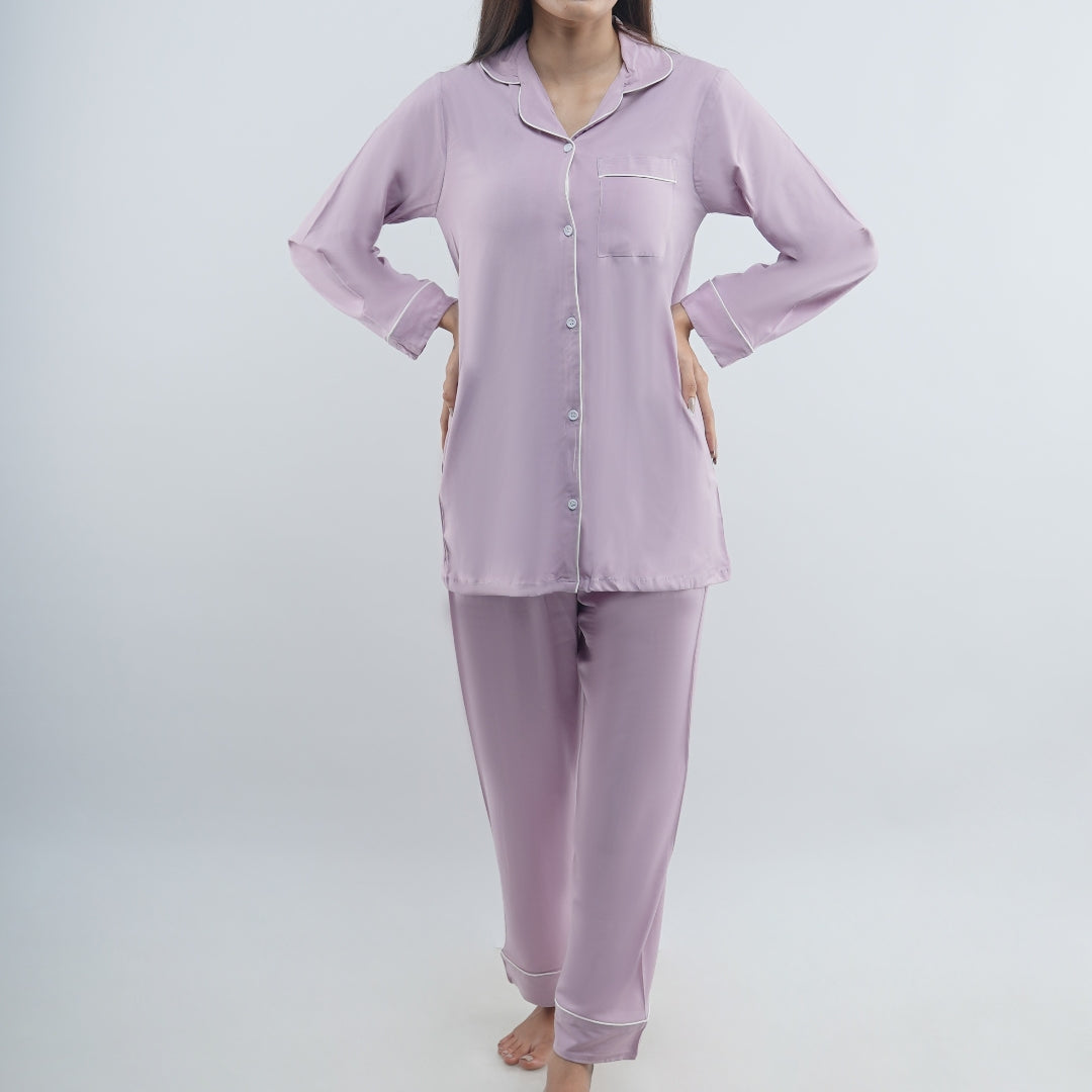 Linen PJ set in soft fabric. Notch collar and button through opening. Full sleeves