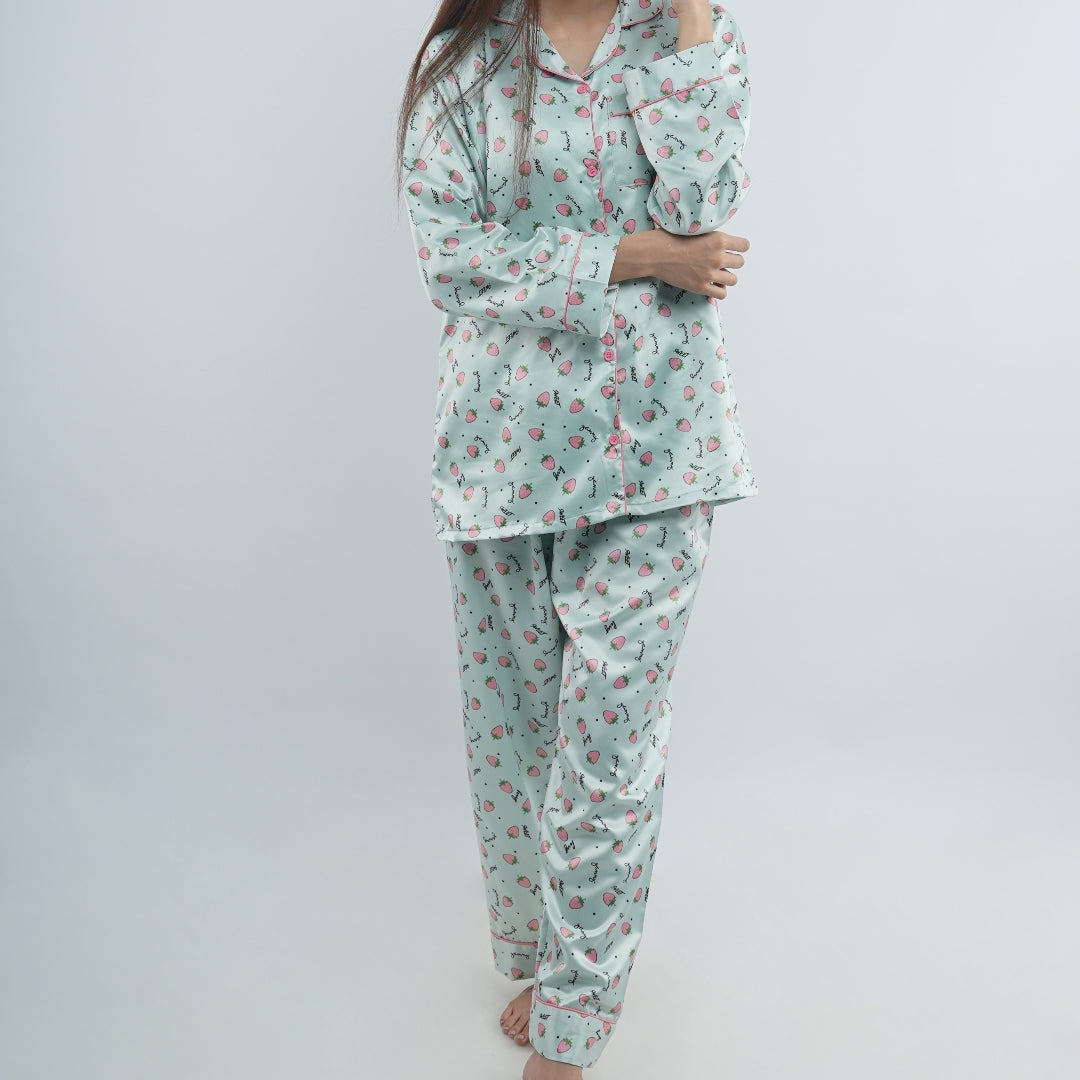 Matt silk PJ set in soft silky fabric. Notch collar and button through opening. Full sleeves