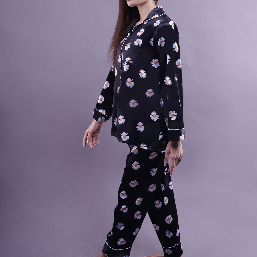Matt silk PJ set in soft silky fabric. Notch collar and button through opening. Full sleeves